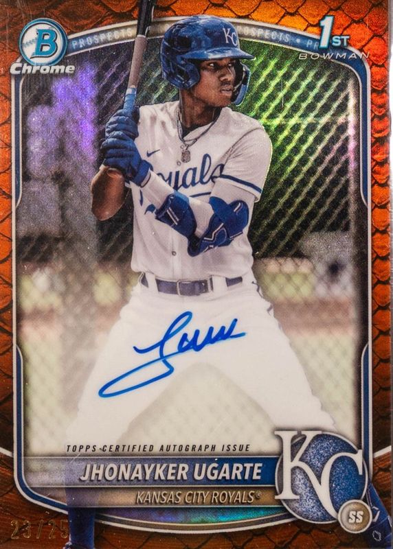 Auctions Ending Soon for Jhonayker Ugarte 2025 Bowman #CPA-JU Chrome Prospect Auto - Reptilian Orange Refractor /25 (1st) RAW
