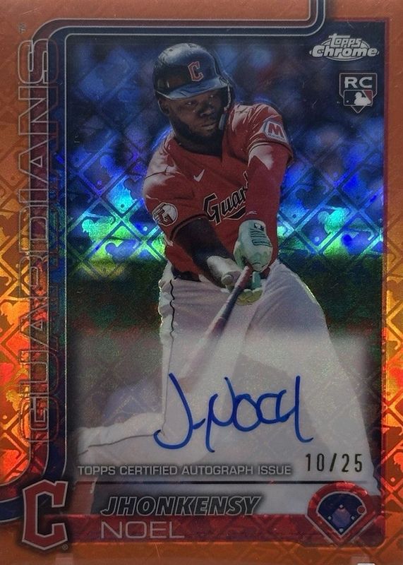 The Jhonkensy Noel 2025 Topps Chrome Logofractor Edition #RA-JN Rookie Autographs - Orange Refractor /25 card in Raw condition has not changed in price in the last 30 days and was last sold for $75.00 .