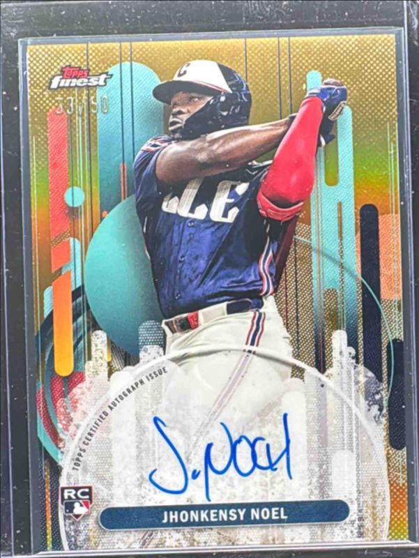The Jhonkensy Noel 2025 Topps Finest #FA-JN Finest Autographs - Gold Refractor /50 Rookie card is 1 of 53 Jhonkensy Noel's card variations in the 2025 Topps Finest set being tracked by Sports Card Investor, including Uncommon, Uncommon - Checkerboard Refractor, Uncommon - Refractor, Uncommon - Magenta Refractor /300, and Uncommon - Sky Blue Refractor /250.