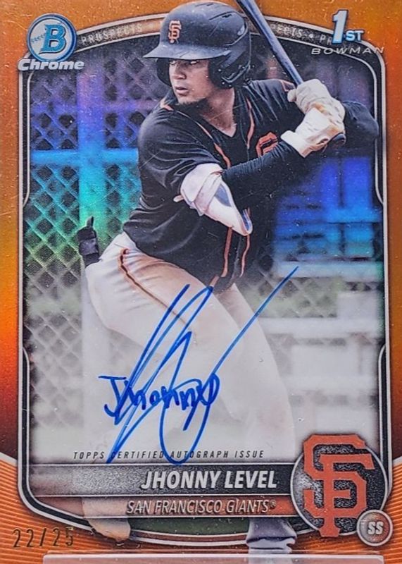 The Jhonny Level 2025 Bowman #CPA-JL Chrome Prospect Auto - Orange Refractor /25 (1st) card in Raw condition has not changed in price in the last 30 days and was last sold for $1,212.00 .