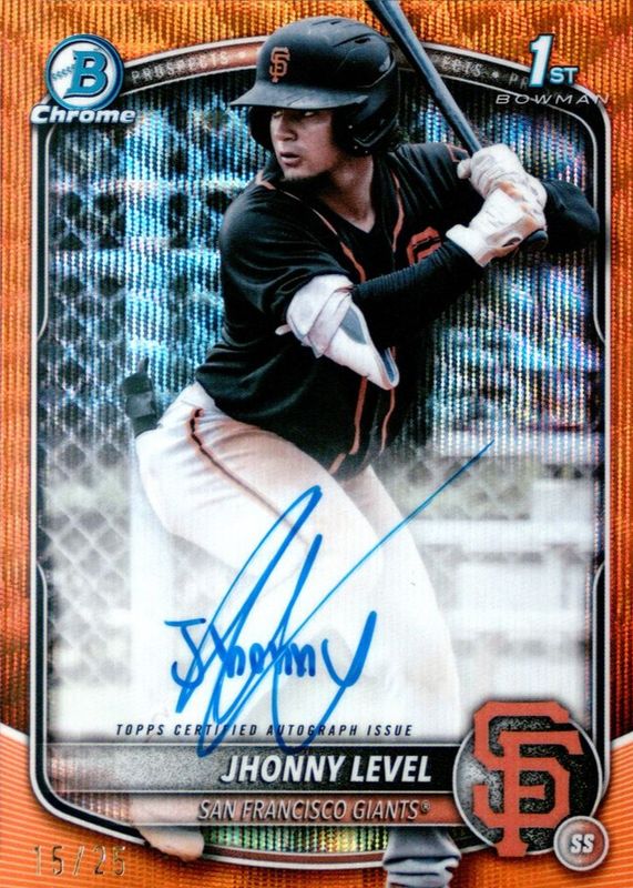 Best Prices Available For Sale of Jhonny Level 2025 Bowman #CPA-JL Chrome Prospect Auto - Orange Shimmer Refractor /25 (1st)