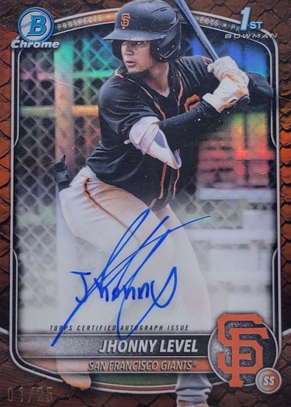 The Jhonny Level 2025 Bowman #CPA-JL Chrome Prospect Auto - Reptilian Orange Refractor /25 (1st) card in Raw condition has not changed in price in the last 30 days and was last sold for $258.66 .