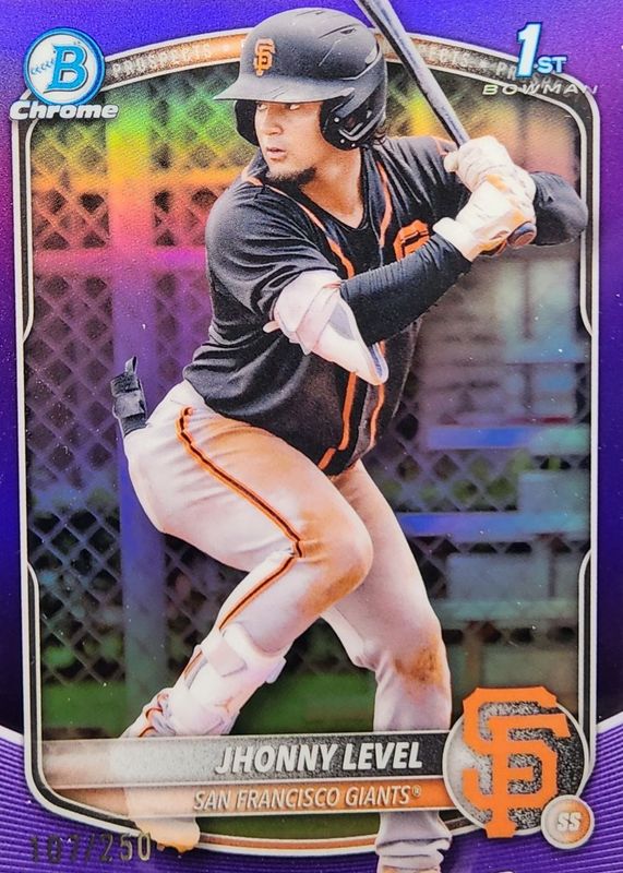 The Jhonny Level 2025 Bowman #BCP-147 Chrome Prospects - Purple Refractor /250 (1st) card in Raw condition has moved down -$5.99 (-50.0%) in the last 30 days and was last sold for $6.00 .