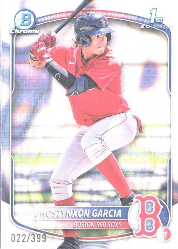 The Jhostynxon Garcia 2025 Bowman #BCP-43 Chrome Prospects - RayWave Refractor /399 (1st) card in Raw condition has not changed in price in the last 30 days and was last sold for $12.99 .