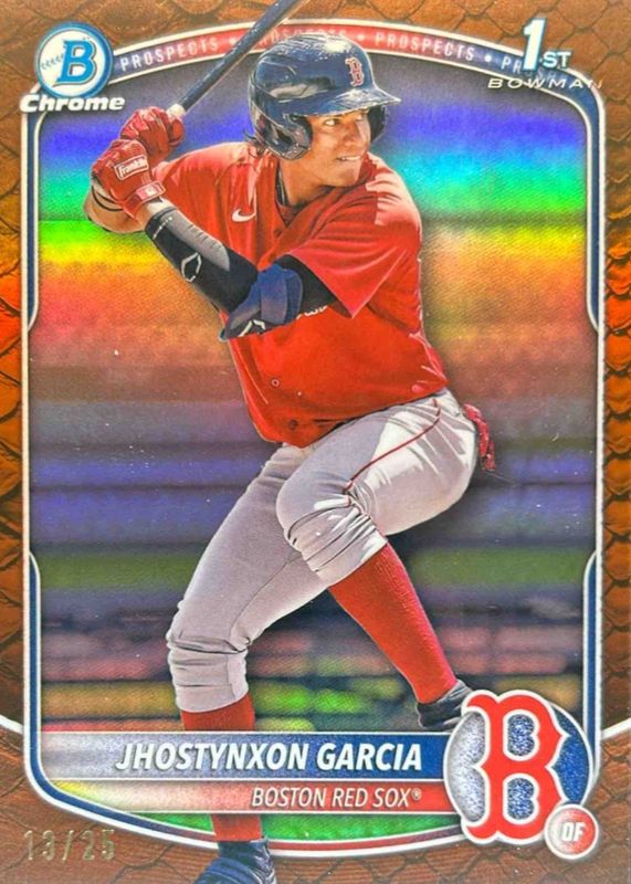 Best Prices Available For Sale of Jhostynxon Garcia 2025 Bowman #BCP-43 Chrome Prospects - Reptilian Orange Refractor /25 (1st)
