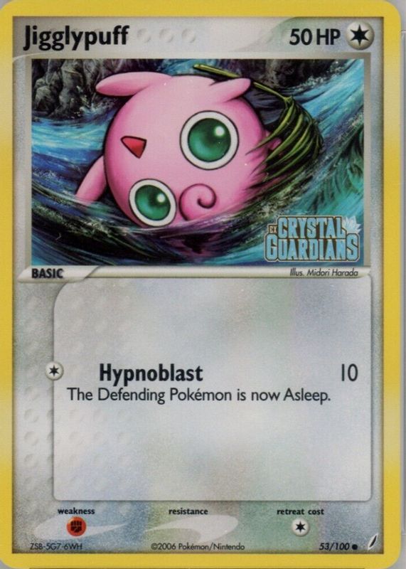 The Jigglypuff 2006 EX: Crystal Guardians #053/100 Reverse Holo card in Raw TCG (Near Mint) condition has moved up $6.50 (+68.4%) in the last 30 days and was last sold for $16.00 .