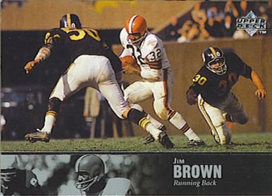 The Jim Brown 1997 Upper Deck Legends #2 Base card is 1 of 3 Jim Brown's card variations in the 1997 Upper Deck Legends set being tracked by Sports Card Investor, including Autographs, and Sign of the Times.