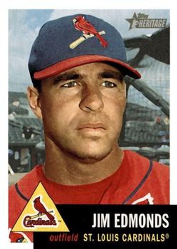 The Jim Edmonds 2002 Topps Heritage #203 Base card is 1 of 4 Jim Edmonds' card variations in the 2002 Topps Heritage set being tracked by Sports Card Investor, including Real One Autographs, Chrome /553, and Real One Autographs - Red Ink /53.