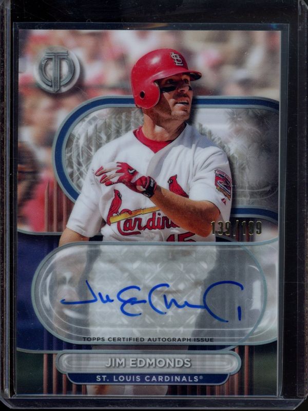 The Jim Edmonds 2024 Topps Tribute #TA-JE Tribute Autographs /199 card is 1 of 12 Jim Edmonds' card variations in the 2024 Topps Tribute set being tracked by Sports Card Investor, including Tribute Autographs - Blue /150, Tribute Autographs - Green /99, Tribute Autographs - Gold /75, Tribute Autographs - Purple /50, and Tribute Autographs - Orange /25.