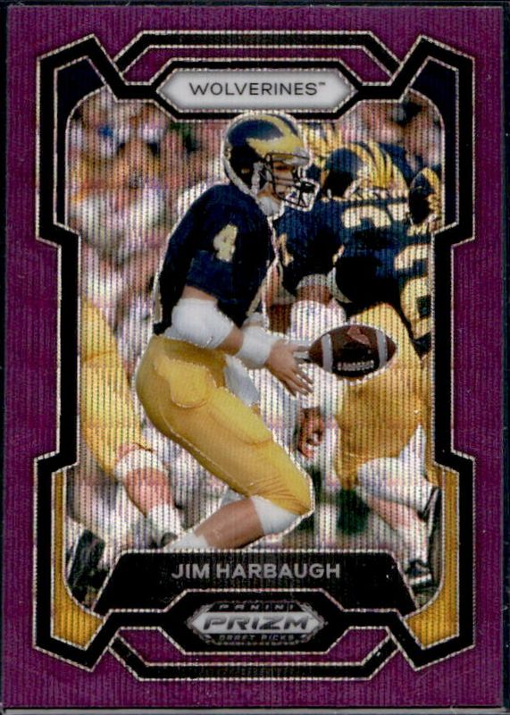 The Jim Harbaugh 2024 Prizm Draft Picks #50 Purple Wave card is 1 of 68 Jim Harbaugh's card variations in the 2024 Prizm Draft Picks set being tracked by Sports Card Investor, including Base, Green, Red Ice, Ruby Wave, and Silver.