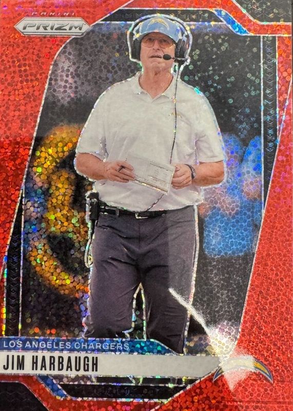 2024 Panini Prizm - Jim Harbaugh ( Los Angeles Chargers ) Red Sparkle Prizm #163