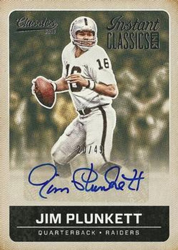 The Jim Plunkett 2016 Classics #IC-JP Instant Classics Ink /49 card is 1 of 20 Jim Plunkett's card variations in the 2016 Classics set being tracked by Sports Card Investor, including Base, Blank Back, Blue Back, Glossy, and No Name.