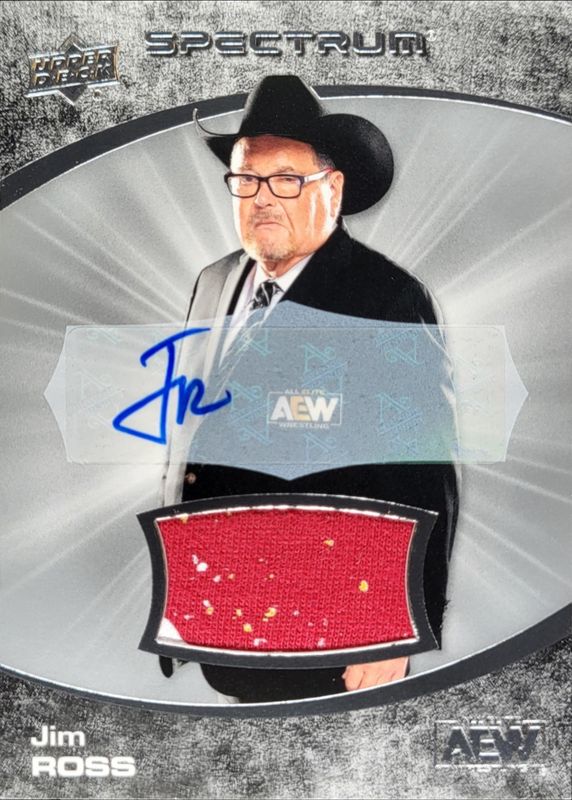 The Jim Ross 2021 Upper Deck AEW Spectrum #67 Autographed Memorabilia /20 card is 1 of 20 Jim Ross' card variations in the 2021 Upper Deck AEW Spectrum set being tracked by Sports Card Investor, including Base, Dark /99, Red /50, Green /25, and Beach /10.