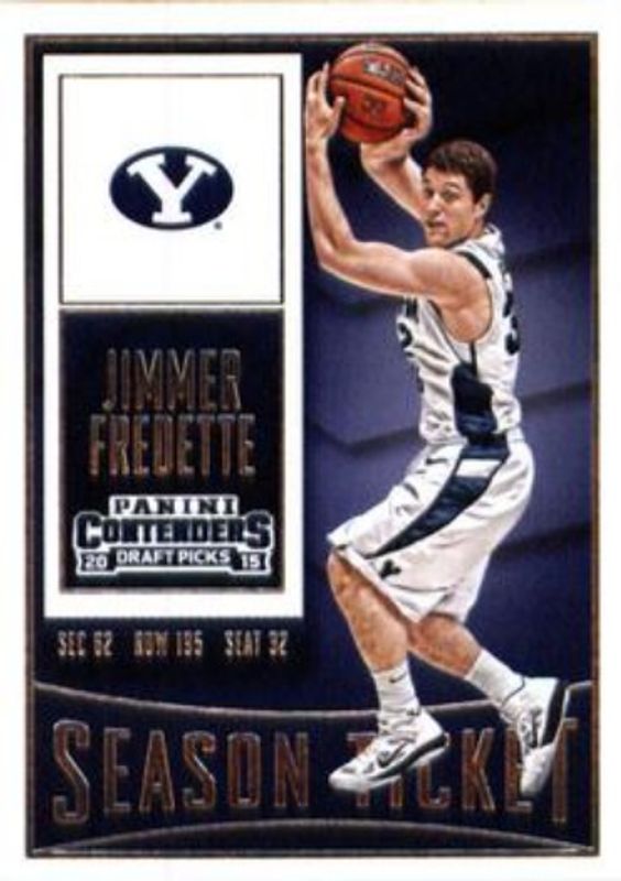 The Jimmer Fredette 2015 Contenders Draft Picks #44 Base card is 1 of 9 Jimmer Fredette's card variations in the 2015 Contenders Draft Picks set being tracked by Sports Card Investor, including Draft Ticket /99, Season Ticket Cracked Ice /23, Championship Ticket /1, Season Ticket Printing Plates Black /1, and Season Ticket Printing Plates Cyan /1.