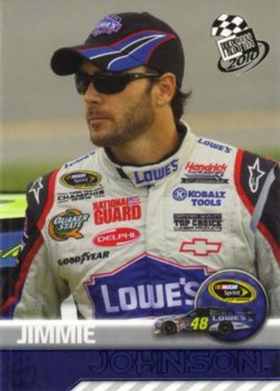 The Jimmie Johnson 2010 Press Pass #4 Blue card is 1 of 56 Jimmie Johnson's card variations in the 2010 Press Pass set being tracked by Sports Card Investor, including #89 Base, #96 Base, #111 Base, #123 Base, and #4 Base.