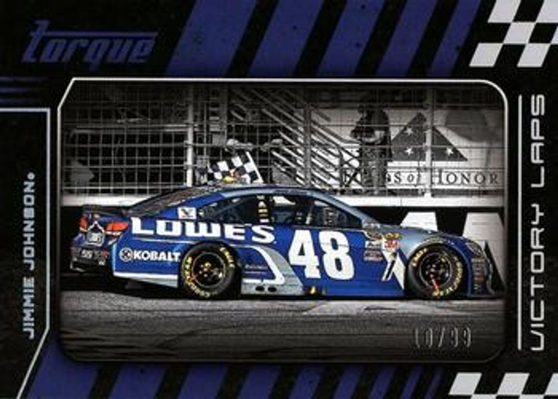 The Jimmie Johnson 2016 Torque NASCAR #VL4 Victory Laps Holo Silver /99 card is 1 of 116 Jimmie Johnson's card variations in the 2016 Torque NASCAR set being tracked by Sports Card Investor, including #4 Base, #74 Base, #74 Gold, #4 Gold, and #74 Blue /125.