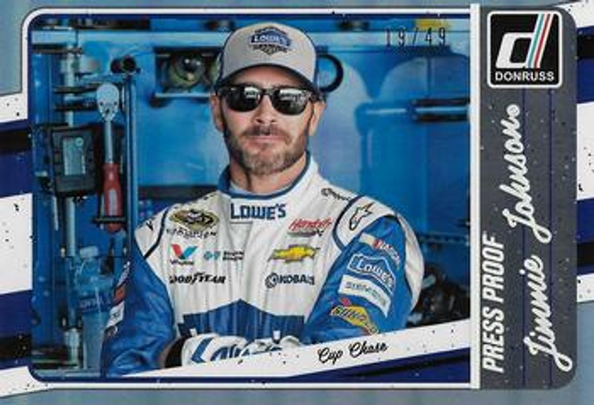 The Jimmie Johnson 2017 Donruss NASCAR #131 Press Proof /49 card is 1 of 115 Jimmie Johnson's card variations in the 2017 Donruss NASCAR set being tracked by Sports Card Investor, including #47a Base, #1 Base, #91 Base, #47c Base, and #47b Base.