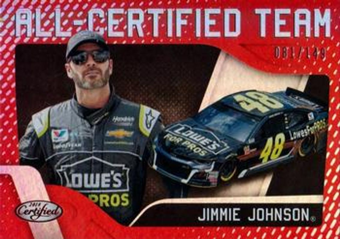 The Jimmie Johnson 2018 Certified NASCAR #ACT5 All Certified Team - Red /149 card is 1 of 99 Jimmie Johnson's card variations in the 2018 Certified NASCAR set being tracked by Sports Card Investor, including #1 Base /149, #94 Base /149, #94 Orange /249, #1 Orange /249, and #94 Mirror Gold /25.