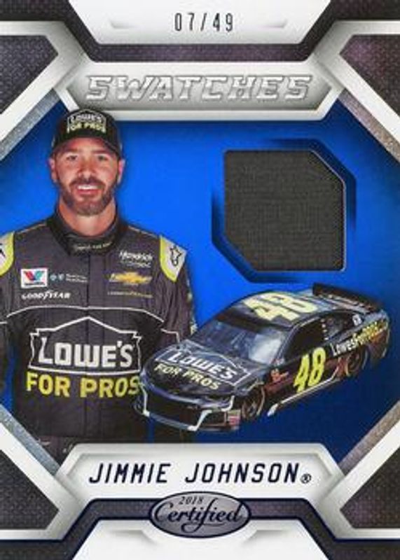 The Jimmie Johnson 2018 Certified NASCAR #CS-JJ Cup Swatches - Blue /49 card is 1 of 99 Jimmie Johnson's card variations in the 2018 Certified NASCAR set being tracked by Sports Card Investor, including #1 Base /149, #94 Base /149, #94 Orange /249, #1 Orange /249, and #94 Mirror Gold /25.