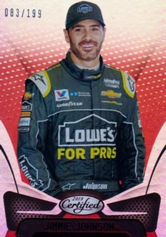 The Jimmie Johnson 2018 Certified NASCAR #1 Red /25 card is 1 of 99 Jimmie Johnson's card variations in the 2018 Certified NASCAR set being tracked by Sports Card Investor, including #1 Base /149, #94 Base /149, #94 Orange /249, #1 Orange /249, and #94 Mirror Gold /25.