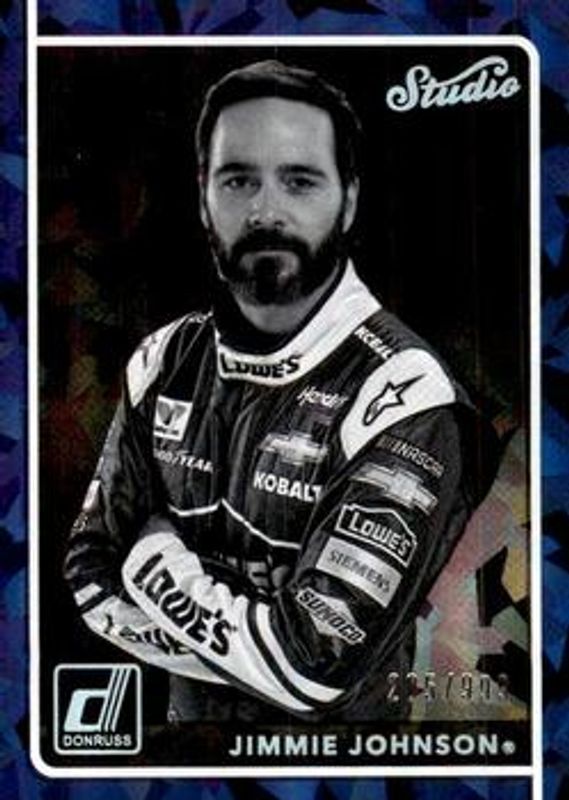 The Jimmie Johnson 2018 Donruss NASCAR #S1 Studio Cracked Ice /999 card is 1 of 90 Jimmie Johnson's card variations in the 2018 Donruss NASCAR set being tracked by Sports Card Investor, including #82 Base, #51b Base, #141b Base, #24 Base, and #51a Base.