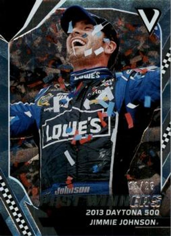 The Jimmie Johnson 2018 Victory Lane NASCAR #100 Blue /25 card is 1 of 196 Jimmie Johnson's card variations in the 2018 Victory Lane NASCAR set being tracked by Sports Card Investor, including #25 Base, #99 Base, #92 Base, #91 Base, and #85 Base.