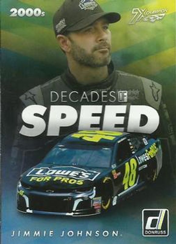The Jimmie Johnson 2019 Donruss NASCAR #DS1 Decades of Speed card is 1 of 110 Jimmie Johnson's card variations in the 2019 Donruss NASCAR set being tracked by Sports Card Investor, including #16 Base, #1 Base, #106b Silver, #106a Silver, and #86 Silver.