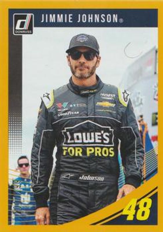 The Jimmie Johnson 2019 Donruss NASCAR #48a Gold /299 card is 1 of 110 Jimmie Johnson's card variations in the 2019 Donruss NASCAR set being tracked by Sports Card Investor, including #16 Base, #1 Base, #106b Silver, #106a Silver, and #86 Silver.