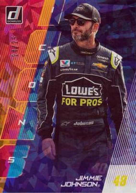 The Jimmie Johnson 2019 Donruss NASCAR #I2 Icons Cracked Ice /25 card is 1 of 110 Jimmie Johnson's card variations in the 2019 Donruss NASCAR set being tracked by Sports Card Investor, including #16 Base, #1 Base, #106b Silver, #106a Silver, and #86 Silver.