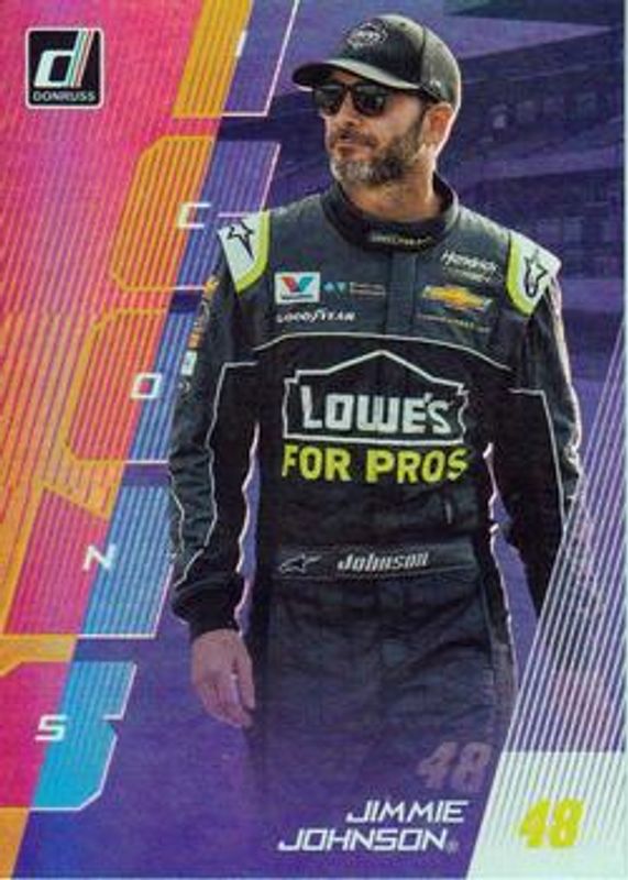 The Jimmie Johnson 2019 Donruss NASCAR #I2 Icons Holographic card is 1 of 110 Jimmie Johnson's card variations in the 2019 Donruss NASCAR set being tracked by Sports Card Investor, including #16 Base, #1 Base, #106b Silver, #106a Silver, and #86 Silver.
