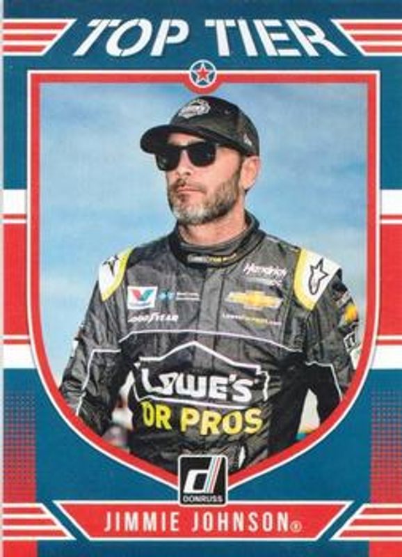 The Jimmie Johnson 2019 Donruss NASCAR #TT1 Top Tier card is 1 of 110 Jimmie Johnson's card variations in the 2019 Donruss NASCAR set being tracked by Sports Card Investor, including #16 Base, #1 Base, #106b Silver, #106a Silver, and #86 Silver.