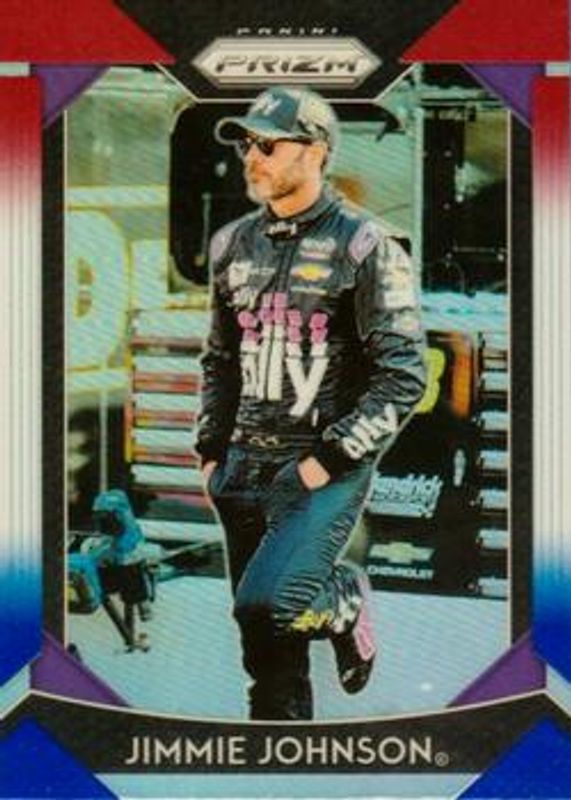 The Jimmie Johnson 2019 Prizm NASCAR #30 Red White Blue card is 1 of 104 Jimmie Johnson's card variations in the 2019 Prizm NASCAR set being tracked by Sports Card Investor, including #81 Base, #73 Base, #52 Base, #30 Base, and #61 Base.