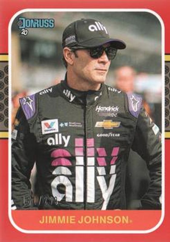 The Jimmie Johnson 2020 Donruss NASCAR #160 Red /299 card is 1 of 153 Jimmie Johnson's card variations in the 2020 Donruss NASCAR set being tracked by Sports Card Investor, including #160 Base, #199 Base, #38 Base, #9 Base, and #98 Base.
