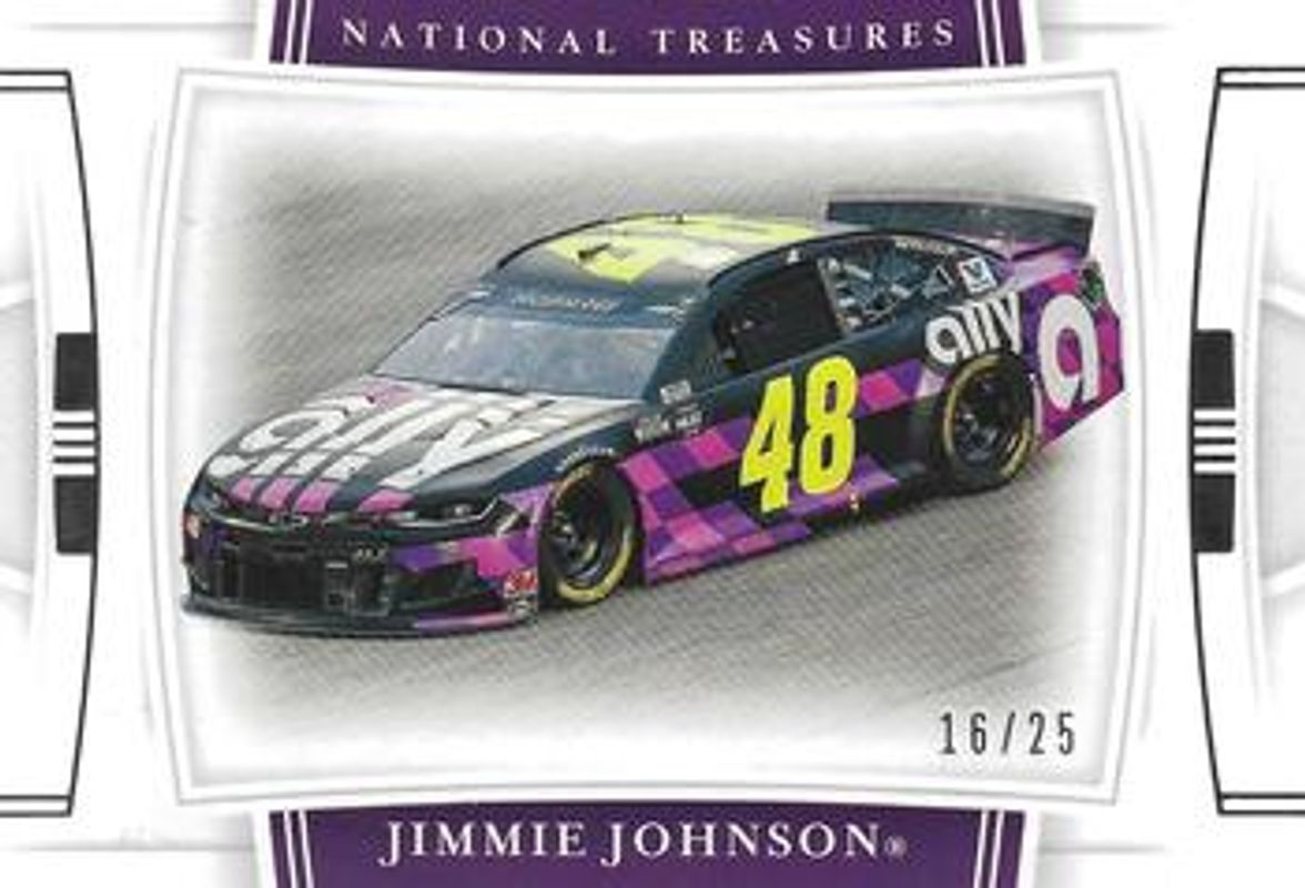 The Jimmie Johnson 2020 National Treasures NASCAR #48 Base /25 card is 1 of 151 Jimmie Johnson's card variations in the 2020 National Treasures NASCAR set being tracked by Sports Card Investor, including #100 Base /25, #7 Base /25, #93 Base /25, #94 Base /25, and #95 Base /25.