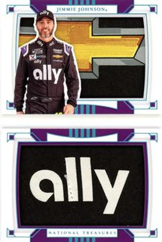 The Jimmie Johnson 2020 National Treasures NASCAR #JJ1 Jumbo Firesuit Patch Booklet Dual Car Manufacturer Primary Sponsor /1 card is 1 of 151 Jimmie Johnson's card variations in the 2020 National Treasures NASCAR set being tracked by Sports Card Investor, including #100 Base /25, #48 Base /25, #7 Base /25, #93 Base /25, and #94 Base /25.