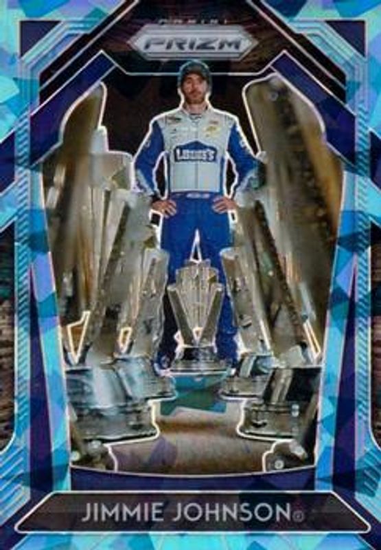 The Jimmie Johnson 2020 Prizm NASCAR #6 Carolina Blue Cracked Ice /25 card is 1 of 135 Jimmie Johnson's card variations in the 2020 Prizm NASCAR set being tracked by Sports Card Investor, including #79 Base, #6 Base, #21b Base, #21a Base, and #84 Base.