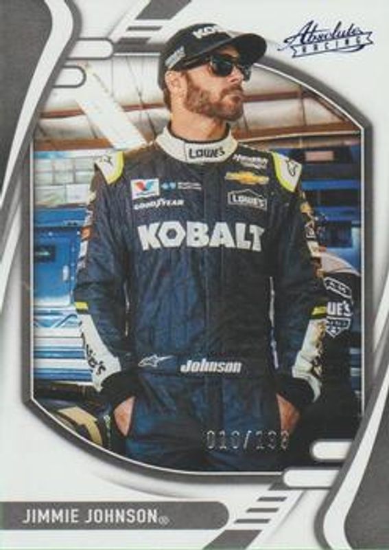 The Jimmie Johnson 2022 Chronicles NASCAR #6 Absolute Blue /199 card is 1 of 152 Jimmie Johnson's card variations in the 2022 Chronicles NASCAR set being tracked by Sports Card Investor, including Base, Chronicles Blue /199, Chronicles Red /99, Chronicles Purple /25, and Chronicles Gold /10.