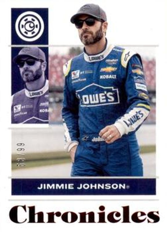The Jimmie Johnson 2022 Chronicles NASCAR #1 Chronicles Red /99 card is 1 of 152 Jimmie Johnson's card variations in the 2022 Chronicles NASCAR set being tracked by Sports Card Investor, including Base, Chronicles Blue /199, Chronicles Purple /25, Chronicles Gold /10, and Chronicles Autographs Purple /7.