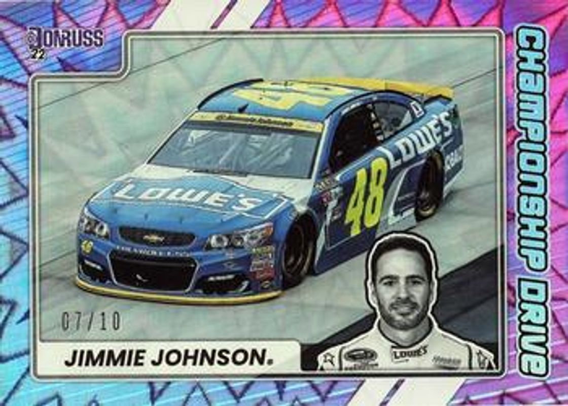 The Jimmie Johnson 2022 Donruss NASCAR #CD8 Championship Drive Xplosion /10 card is 1 of 141 Jimmie Johnson's card variations in the 2022 Donruss NASCAR set being tracked by Sports Card Investor, including #57 Base, #139 Base, #149 Base, #173 Base, and #2 Base.