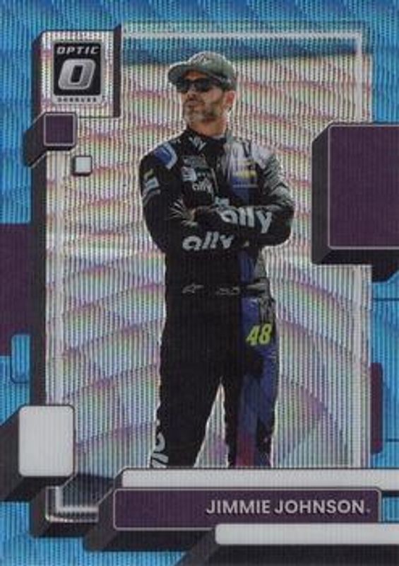 The Jimmie Johnson 2023 Donruss NASCAR #43 Optic Carolina Blue Wave card is 1 of 169 Jimmie Johnson's card variations in the 2023 Donruss NASCAR set being tracked by Sports Card Investor, including #89 Base, #174 Base, #20 Base, #34 Base, and #35 Base.