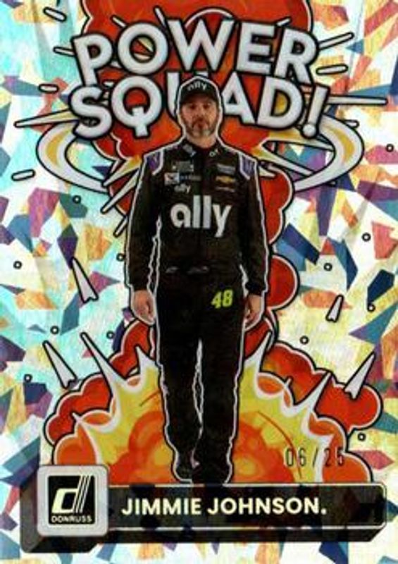 The Jimmie Johnson 2023 Donruss NASCAR #PS6 Power Squad Cracked Ice /25 card is 1 of 169 Jimmie Johnson's card variations in the 2023 Donruss NASCAR set being tracked by Sports Card Investor, including #89 Base, #174 Base, #20 Base, #34 Base, and #35 Base.