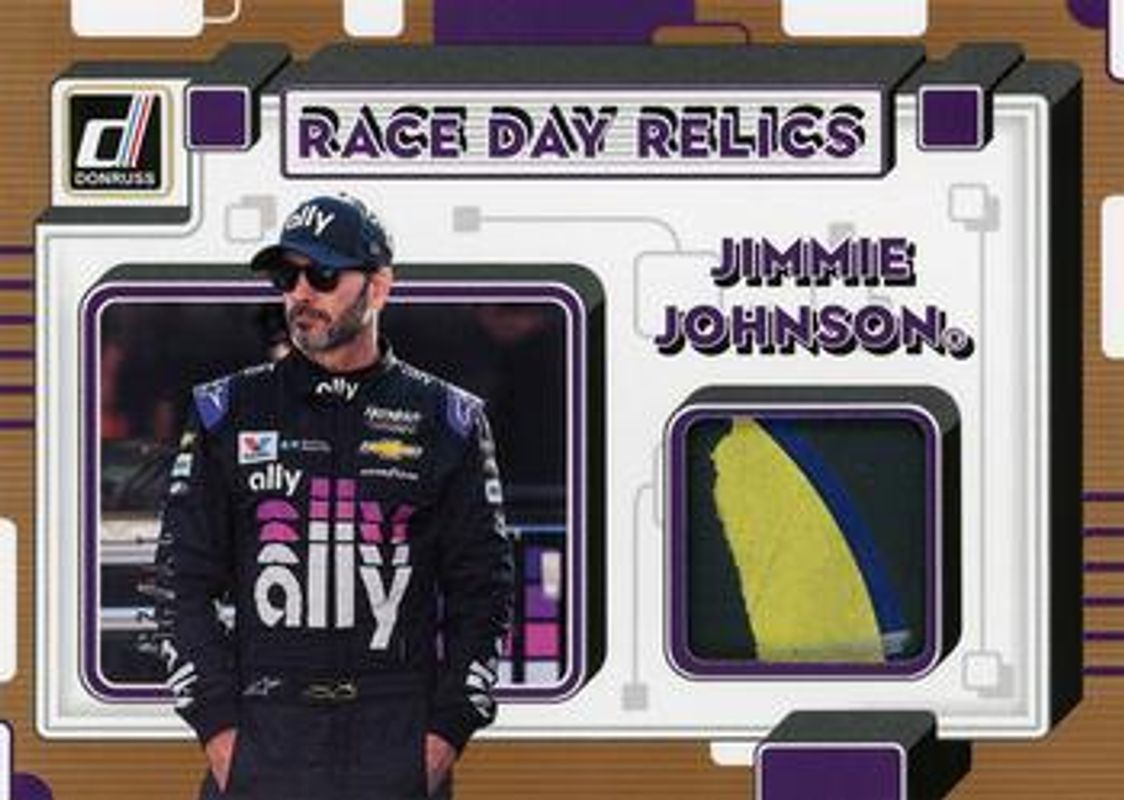 The Jimmie Johnson 2023 Donruss NASCAR #RR-JJ Race Day Relics - Holo Gold /25 card is 1 of 169 Jimmie Johnson's card variations in the 2023 Donruss NASCAR set being tracked by Sports Card Investor, including #89 Base, #174 Base, #20 Base, #34 Base, and #35 Base.