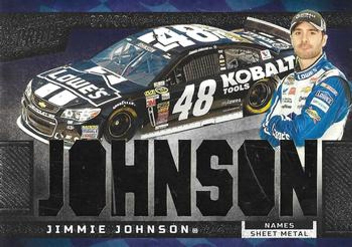 The Jimmie Johnson 2023 Panini Prime #N-JJO Names Sheet Metal /99 card is 1 of 58 Jimmie Johnson's card variations in the 2023 Panini Prime set being tracked by Sports Card Investor, including #91 Base /49, #74 Base /49, #91 Holo Gold /25, #74 Holo Gold /25, and #74 Holo Silver /10.
