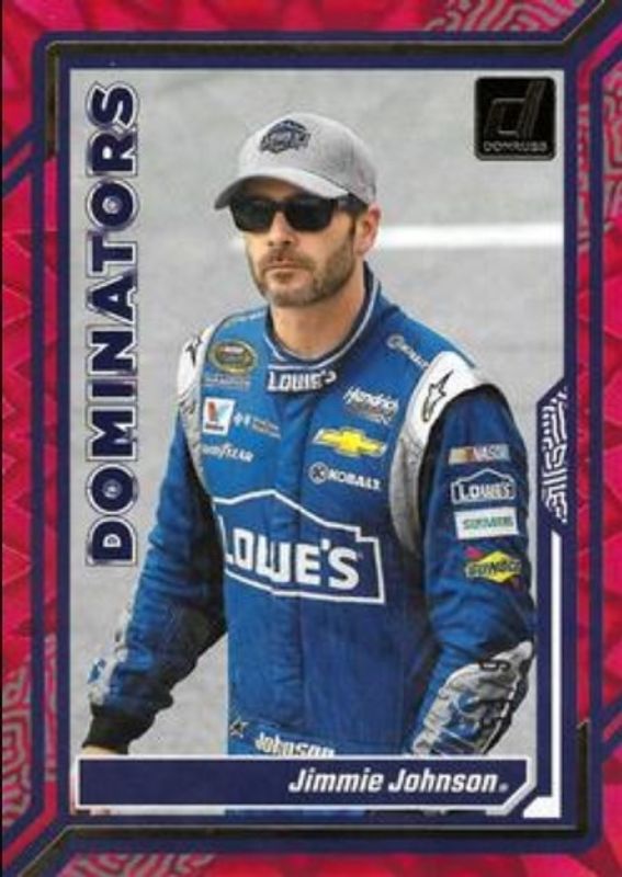 The Jimmie Johnson 2024 Donruss NASCAR #4 Dominators Red Xplosion /99 card is 1 of 128 Jimmie Johnson's card variations in the 2024 Donruss NASCAR set being tracked by Sports Card Investor, including #69 Base, #193 Base, #69 Optic, #193 Optic, and #193 Optic Black Pandora.