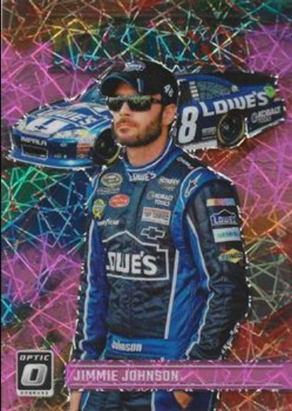 The Jimmie Johnson 2024 Donruss NASCAR #193 Optic Pink Velocity /79 card is 1 of 128 Jimmie Johnson's card variations in the 2024 Donruss NASCAR set being tracked by Sports Card Investor, including #69 Base, #193 Base, #69 Optic, #193 Optic, and #193 Optic Black Pandora.