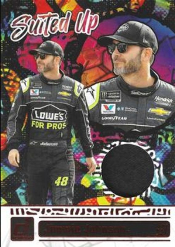 The Jimmie Johnson 2024 Donruss NASCAR #SU-JJ Suited Up Swatches - Red /99 card is 1 of 128 Jimmie Johnson's card variations in the 2024 Donruss NASCAR set being tracked by Sports Card Investor, including #69 Base, #193 Base, #69 Optic, #193 Optic, and #193 Optic Black Pandora.