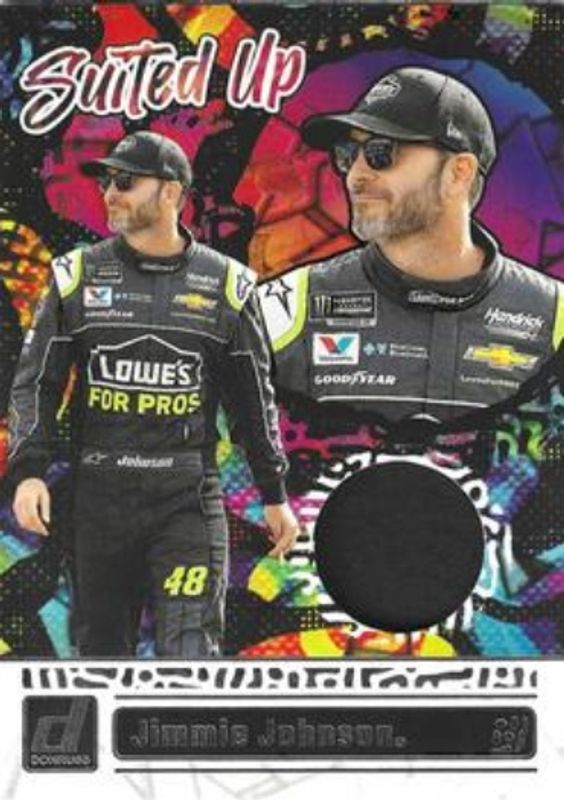 The Jimmie Johnson 2024 Donruss NASCAR #SU-JJ Suited Up Swatches card is 1 of 128 Jimmie Johnson's card variations in the 2024 Donruss NASCAR set being tracked by Sports Card Investor, including #69 Base, #193 Base, #69 Optic, #193 Optic, and #193 Optic Black Pandora.