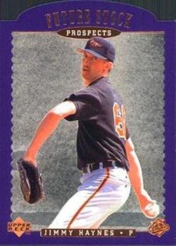 The Jimmy Haynes 1996 Upper Deck #FS13 Future Stock Prospects Rookie card is 1 of 2 Jimmy Haynes' card variations in the 1996 Upper Deck set being tracked by Sports Card Investor, including Base.