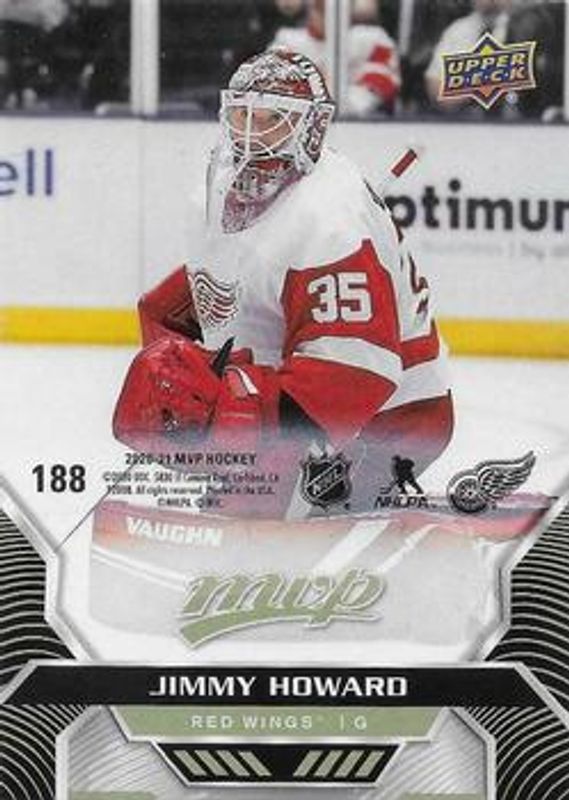 The Jimmy Howard 2020 Upper Deck MVP #188 Puzzle Backs card is 1 of 12 Jimmy Howard's card variations in the 2020 Upper Deck MVP set being tracked by Sports Card Investor, including Base, Blue, Gold Script, Silver Script, and Super Script /25.