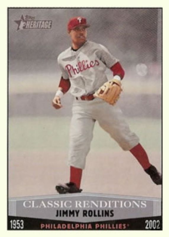 The Jimmy Rollins 2002 Topps Heritage #CR-8 Classic Renditions card is 1 of 4 Jimmy Rollins' card variations in the 2002 Topps Heritage set being tracked by Sports Card Investor, including Base, Chrome /553, and Classic Renditions Autographs /25.